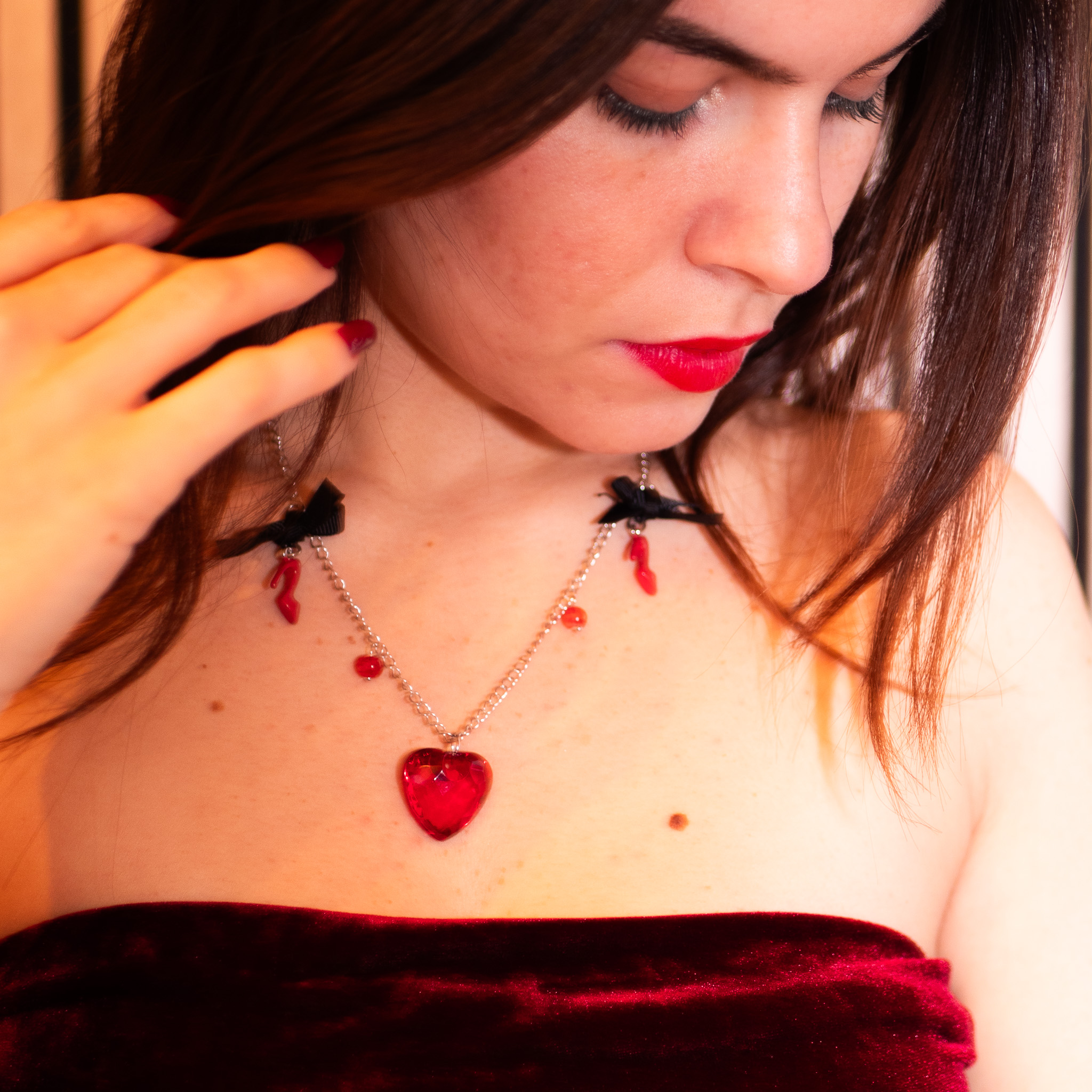Chaîne gourmette torsadée acier inoxydable argentée composée de perles nervurées rouges en résine, breloques escarpins rouges en émail avec nœuds noirs et d’un gros cœur rouge brillant prêt à battre la chamade pour l’élu. Fermoir en T.